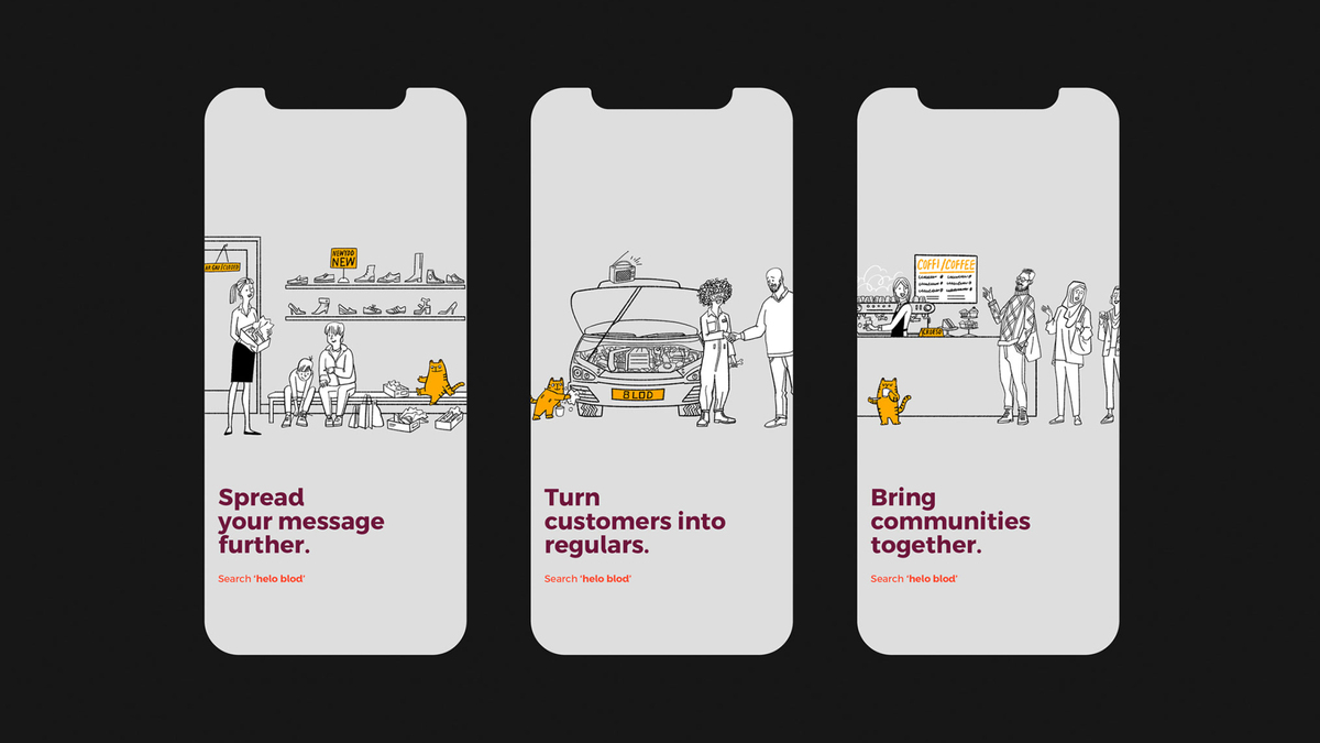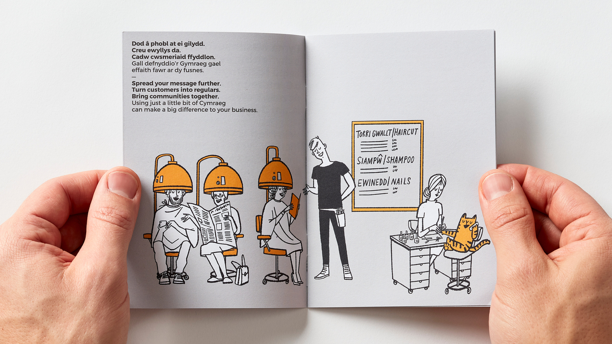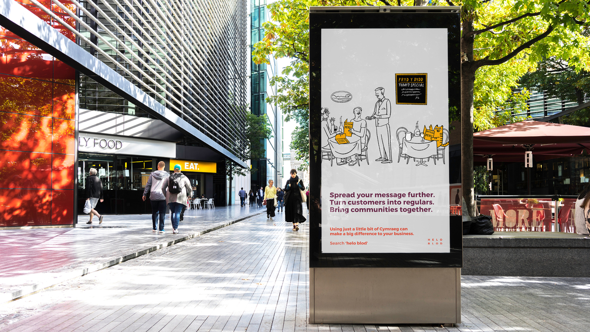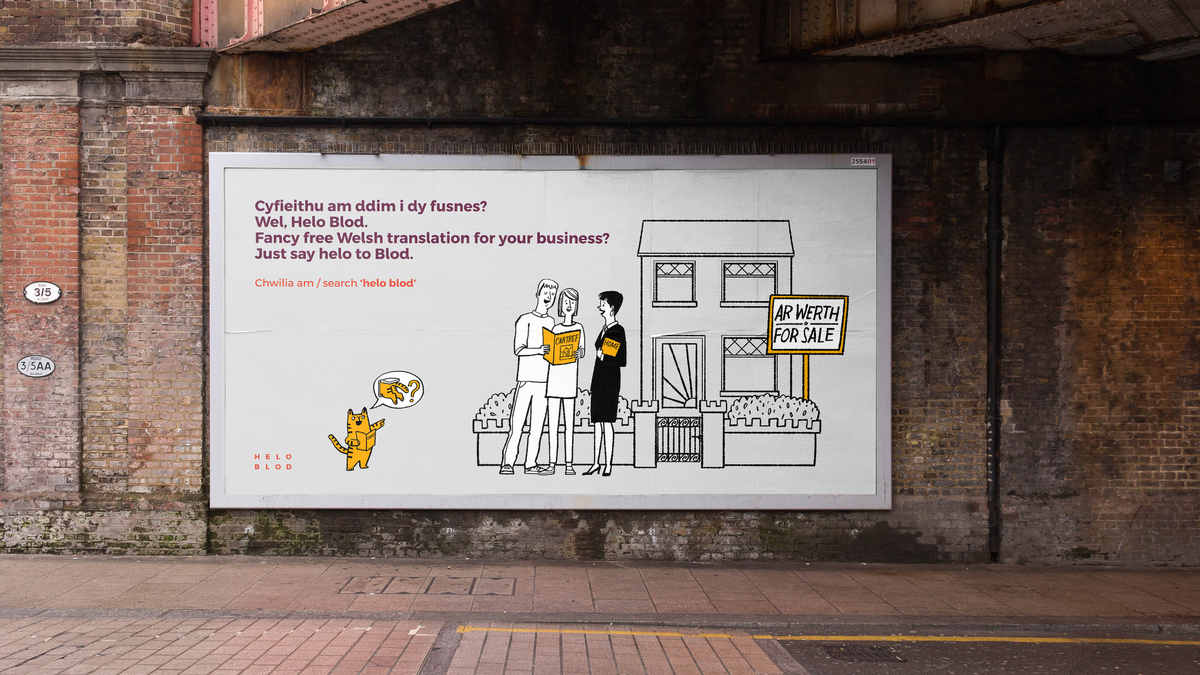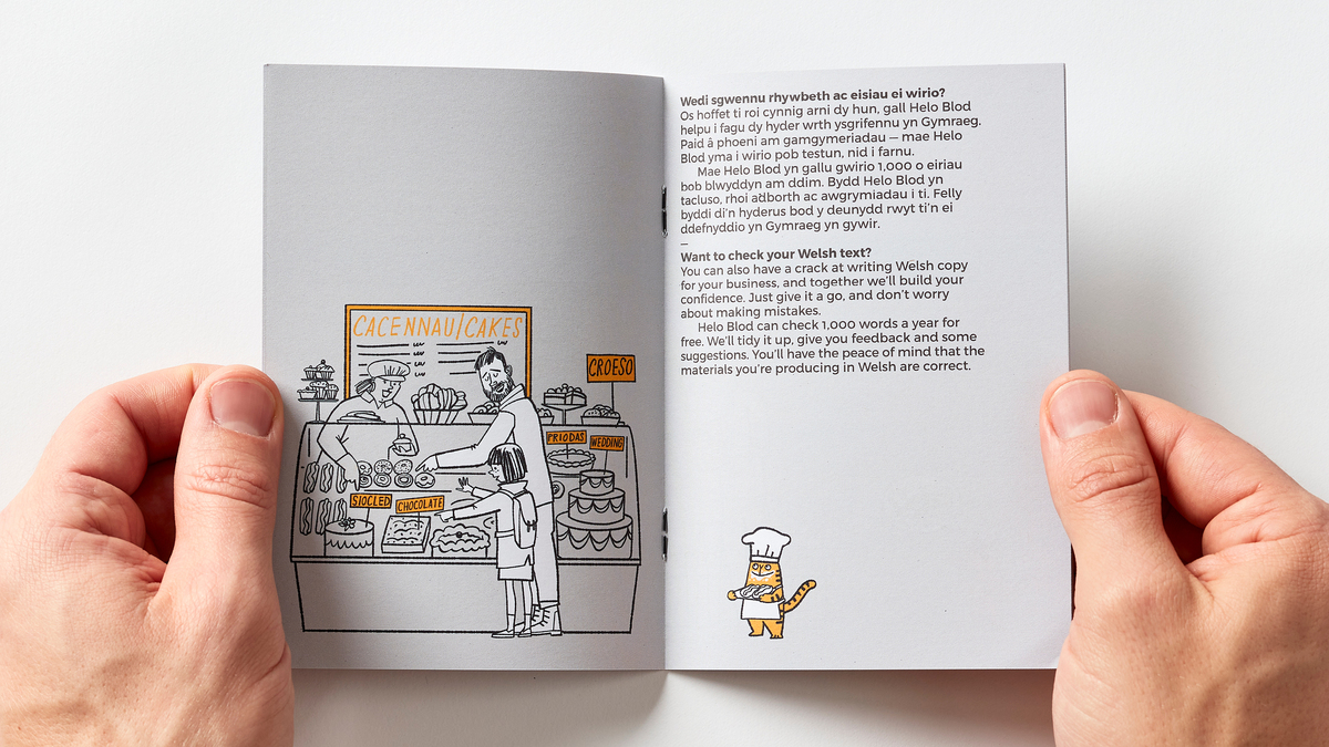 A Welsh translation service for your business, Helo Blod can translate up to a thousand words each month, for free. But how do you make something pretty functional appear more personal and engaging? We created a brand that connects with its audience, focusing more on emotional rather than rational benefits. And using a series of illustrations, the visual identity reinforced the brand message with friendly, playful scenarios that helped convey how businesses could take more of a bilingual approach in their operations.